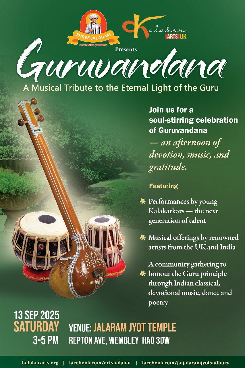 Guruvandana Guruvandana on September 13,2025 + Add to Google Calendar + iCal / Outlook export Date Sep 13 2025 Expired! Time 3:00 pm - 5:00 pm Location Jalram Joti Temple Wembley Share this event